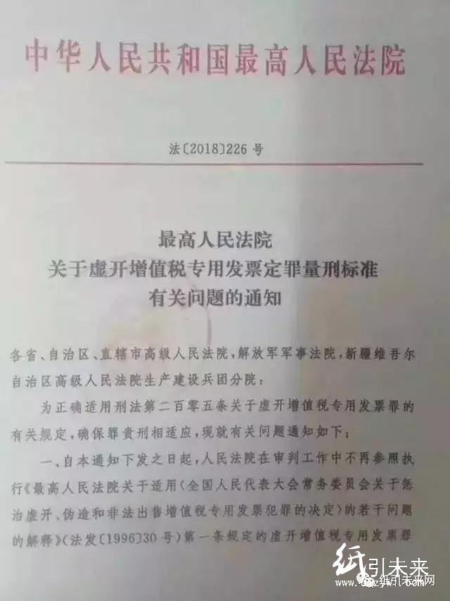 紙引未來(lái)網(wǎng)訊 2018年8月22日 ,最高人民法院發(fā)布了關(guān)于虛開(kāi)增值稅專(zhuān)用發(fā)票定罪量刑標(biāo)準(zhǔn)有關(guān)問(wèn)題的通知。(下文有文字版)