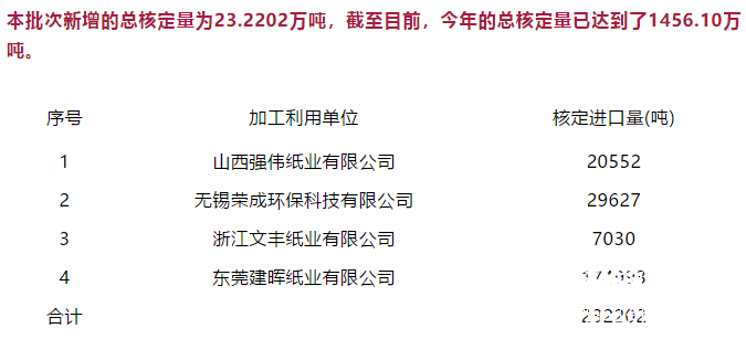 核心提示:9月5日,環保部固體廢物與化學品管理技術中心公示了今年第19批限制進口類產品明細,共有5家企業獲批,分別是山西強偉紙業有限公司、無錫榮成環保科技有限公司、浙江文豐紙業有限公司、東莞建暉紙業有限公司和玖龍紙業(東莞)有限公司,其中玖龍紙業(東莞)有限公司是之前批次更換口岸。