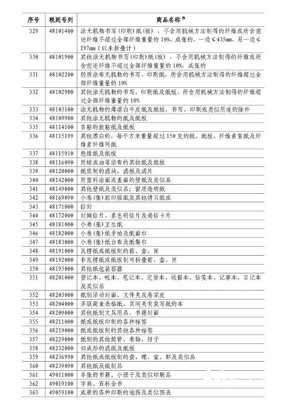 與8月份公布措施有變化的是,原來計劃加稅20%-25%的產品,最終確定的加征稅率下調到了10%。主要是生活用紙、特種紙、新聞紙、部分文化紙、瓦楞原紙、箱板紙以及部分紙制品等。這些產品的關稅原來多在5%-7.5%左右。