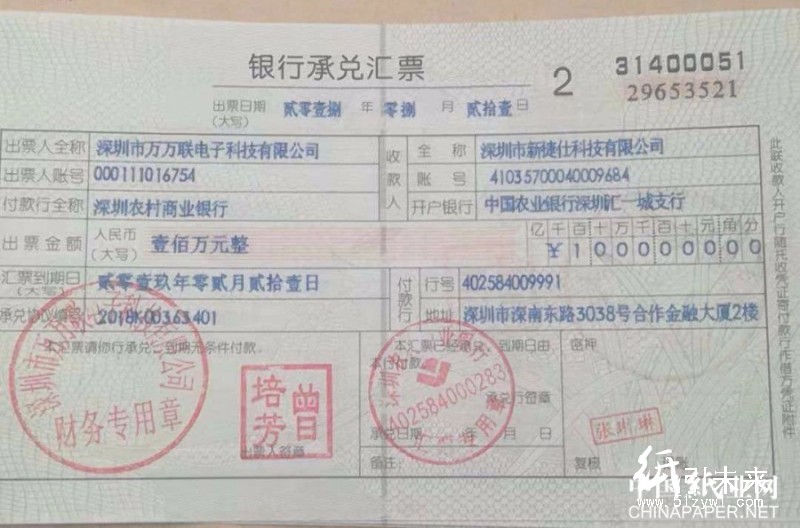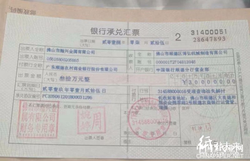 紙引未來網訊 近日,市場上一批票面金額30萬到100萬不等的假紙質銀行承兌匯票正在流通。各位紙箱廠的朋友們收票時務必辨別清楚,錢都不是刮來的,千萬小心!