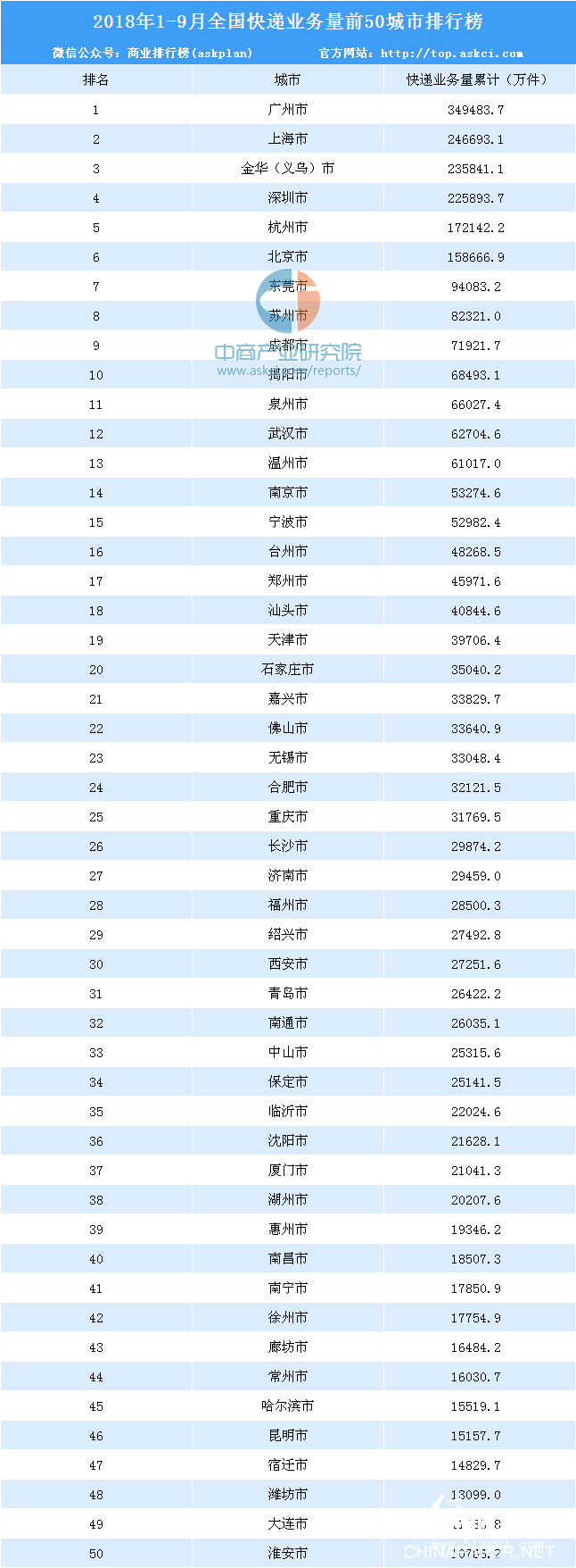 紙引未來網訊 日前,國家郵政局發布了2018年9月郵政快遞行業運行情況。據數據顯示,1-9月,郵政行業業務收入(不包括郵政儲蓄銀行直接營業收入)累計完成5673.4億元,同比增長20.9%;業務總量累計完成8565.2億元,同比增長27.2%。9月份,全行業業務收入完成686.2億元,同比增長17.5%;業務總量完成1065.1億元,同比增長22.6%。快遞方面,1-9月,全國快遞服務企業業務量累計完成347.4億件,同比增長26.8%;業務收入累計完成4246.3億元,同比增長24%。其中,同城業務量累計完成79.7億件,同比增長24.8%;異地業務量累計完成259.8億件,同比增長27.1%;國際/港澳臺業務量累計完成7.9億件,同比增長39.3%。9月份,全國快遞服務企業業務量完成44.8億件,同比增長24.1%;業務收入完成531.1億元,同比增長18.5%。分城市來看,2018年1-9月全國快遞業務量最多的城市為廣州,業務量達34.9億件。以下為2018年1-9月全國快遞業務量前50城市具體排名: