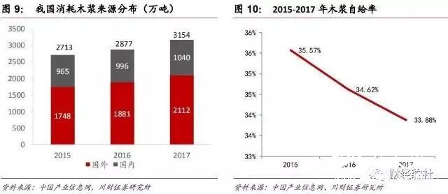 (2)由于我國森林保有量較低,因此森林砍伐受限制較多。森林資源的稀缺性決定了我國木漿產量較低,供給有限,自給率較低。中國全面停止天然林商業性采伐共分為三步實施,于  2017 年年底前全面停止了天然林砍伐。