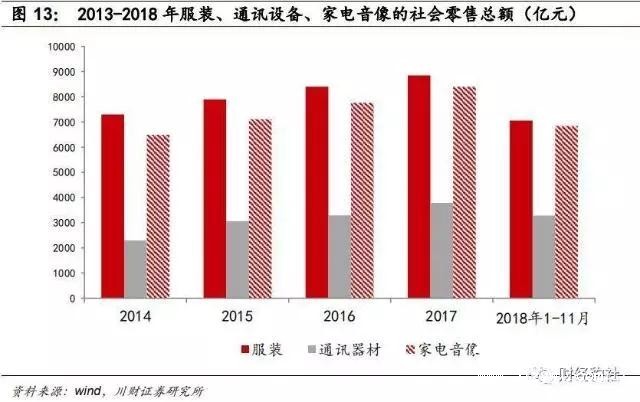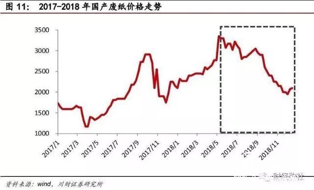 從消費品社會零售總額來看,以服裝、通訊器材、家電音像為例,2017 年零售額 8397.50 億元、3291.60 億元、7757.00 億元,增速分別為 6.29%、7.42%、9.17%,從歷史增速來看,2017 年增速已經有所放緩。2018 年 1-11 月服裝、通訊器材、家電音像銷售額分別是 7054.10 萬元、3280.10 萬元、6843.20 萬元,按照往年 12 月的銷售情況看來,預計今年的銷售額與 2017 年基本持平甚至略有下滑。下游增速的放緩,使得包裝紙需求趨于穩定,市場空間有限, 需求疲弱也是下半年國廢價格持續走低的原因。