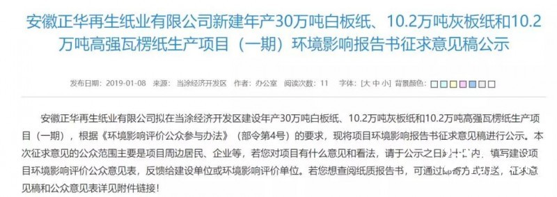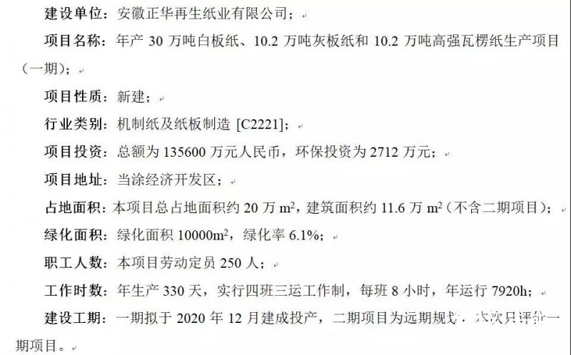 紙引未來網訊 安徽正華再生紙業有限公司新建年產30萬噸白板紙、10.2萬噸灰板紙和10.2萬噸高強瓦楞紙張生產項目(一期),目前進入環評公示階段。