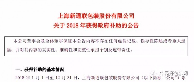 紙引未來網訊 2019年1月11日,上海新通聯包裝股份有限公司發布公告稱,在2018年1月1日至12月31日,公司累計獲得政府補助資金共計人民幣 413.80萬元。