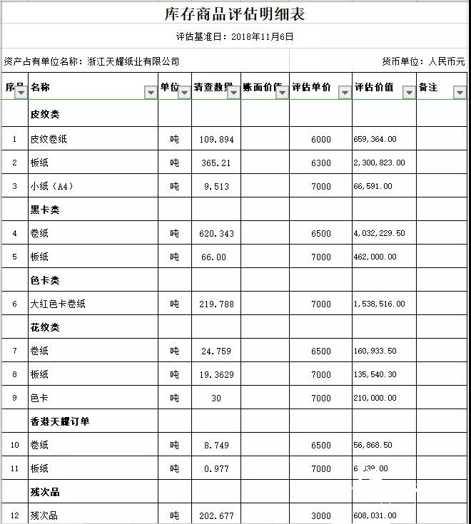 拍賣標的:浙江天耀紙業有限公司所有的原材料、庫存商品