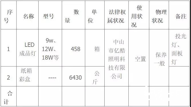 拍賣標的:中山市億酷照明科技有限公司所有的LED成品燈及紙箱彩盒等資產一批