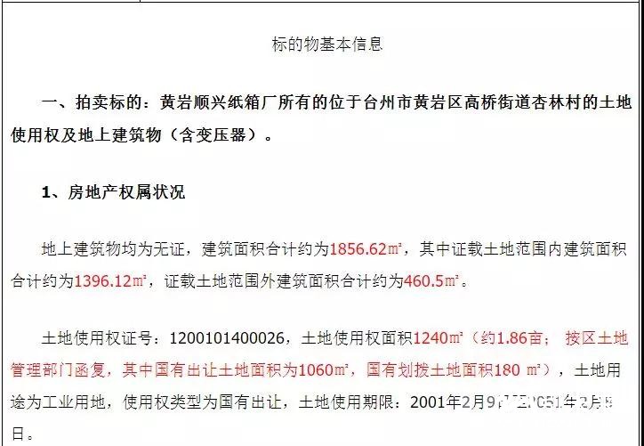 拍賣標的:順興紙箱廠的臺州市黃巖區高橋街道杏林村的國有土地使用權及地上建筑物(含變壓器)