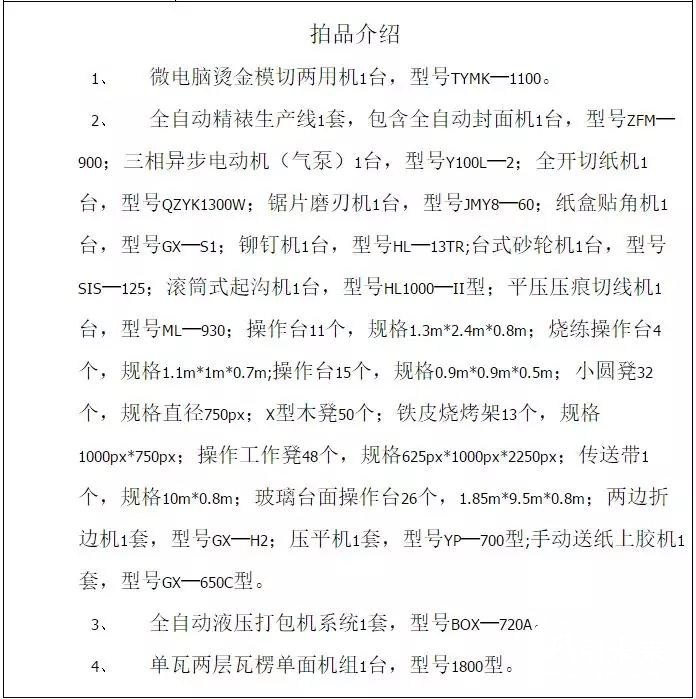 拍賣標的:全自動燙金模切機、單瓦兩層瓦楞單機組、全自動精裱生產線、全自動液壓打包機系統