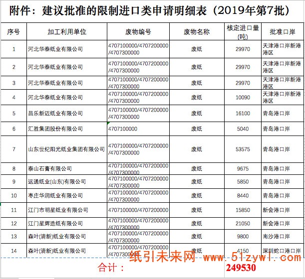 紙引未來網(wǎng)訊2019年5月10日,固廢中心公布的2019年第7批限制進口類申請明細表顯示,通過河北華泰紙業(yè)有限公司,昌樂新邁紙業(yè)有限公司,匯勝集團股份有限公司,山東世紀陽光紙業(yè)集團有限公司,泰山石膏有限公司,遠通紙業(yè)(山東)有限公司,棗莊華潤紙業(yè)有限公司,江門市明星紙業(yè)有限公司,江門星輝紙業(yè)有限公司,森葉(清新)紙業(yè)有限公司共計廢紙核定進口總量為24.9530萬噸。
