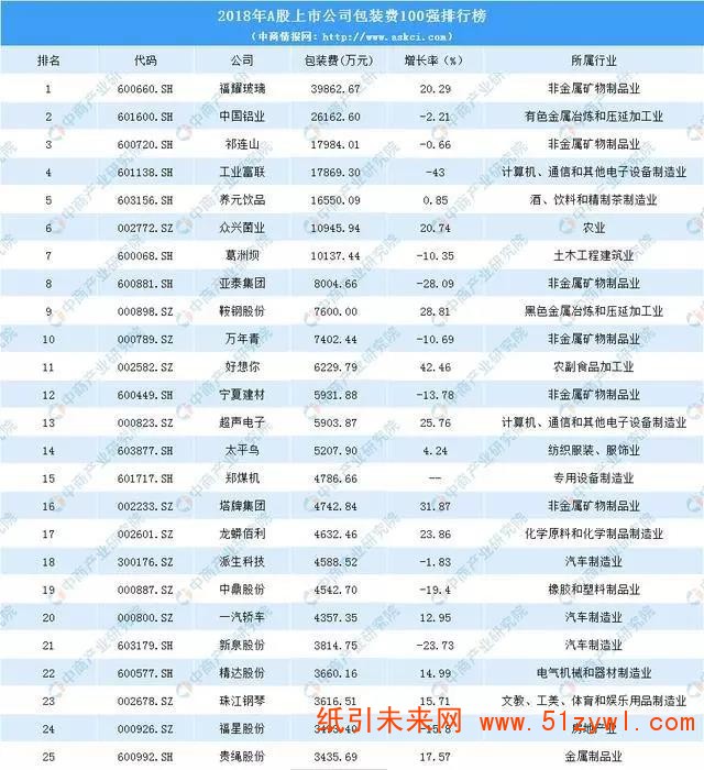 具體來看,2018年上市公司包裝費用超億的企業(yè)有福耀玻璃、中國鋁業(yè)、祁連山、工業(yè)富聯(lián)、養(yǎng)元飲品、眾興菌業(yè)、葛洲壩,共合計包裝費用達13.95億元。其中,中國鋁業(yè)、祁連山、工業(yè)富聯(lián)、葛洲壩呈現(xiàn)不同程度的下滑。以下為具體名單: