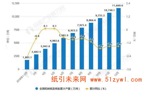 2018年1-12月全國(guó)機(jī)制紙及紙板產(chǎn)量統(tǒng)計(jì)及增長(zhǎng)情況
