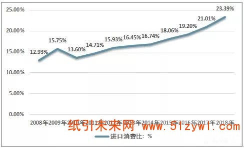據統計2008年以來除2013年以及2018年國內需求下降以外,其余年度均保持增長態,2008年以來我國紙漿年均消耗增速超過2.5%;總體而言我國紙漿的消耗依然是以國產為主,進口紙漿為輔。其中國產紙漿消耗量近年來逐漸趨于穩定,然而每年通過進口而消耗的紙漿總量卻在逐年增加,2018年我國進口紙漿消耗總量創歷史新高,達到2196萬噸。