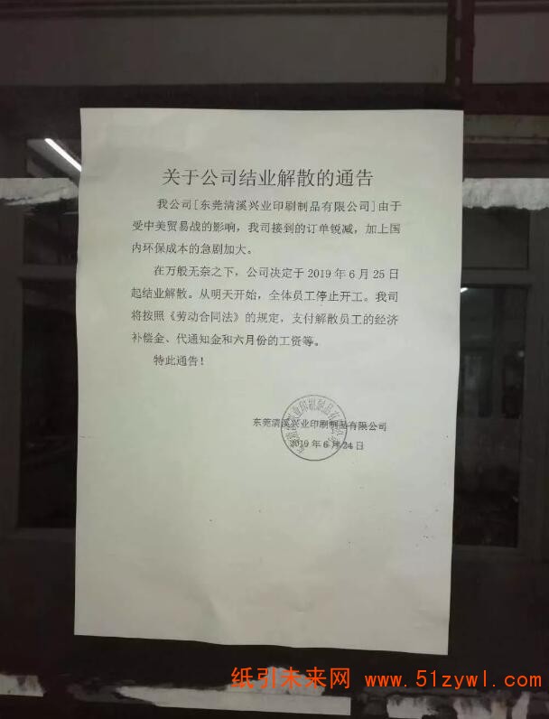 紙引未來網訊 在環保和貿易戰的雙重打擊之下,包裝印刷企業困境重生,有的甚至走上了消亡之路。6月24日,東莞清溪興業印刷制品有限公司發布結業通知稱,受到中美貿易戰影響,近期訂單量銳減,加上國內環保成本加大,決定于6月25日結業解散。