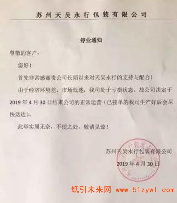 印刷企業如此,紙箱企業亦是如此。在今年4月份的最后一天,江蘇省蘇州市天吳永行包裝有限公司發布停業通知稱,由于經濟環境差,市場低迷,公司處于虧損狀態,只好結束正常運營。