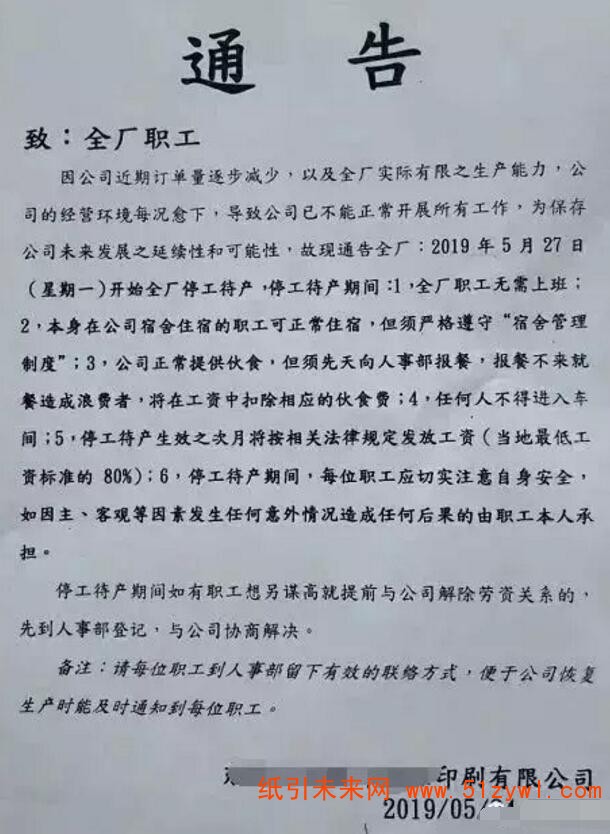 猶記得在上個月底,同樣位于東莞地區的另一家印刷企業也發布類似的通告稱,近期訂單量逐步減少,公司的經營環境每況愈下,不能正常開展所有工作,為保存公司未來發展的延續性和可能性,將從2019年5月27起全廠停工待產。