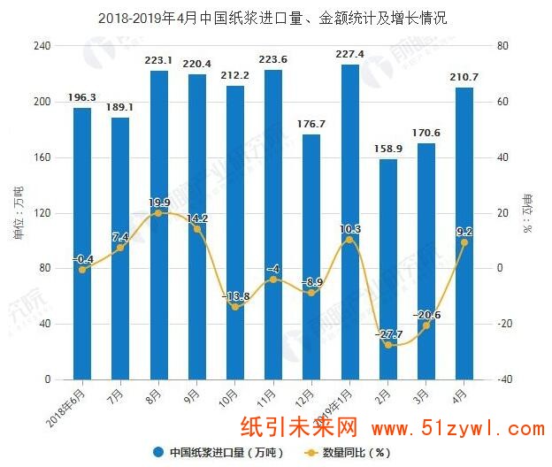 據數據顯示,2018年1-4季度中國紙漿進口量波動幅度較小,波動幅度不超5%。2019年4月中國紙漿進口量為210.7萬噸,同比增長9.2%。2019年1-4月中國紙漿進口量達到768萬噸,同比下降6%。