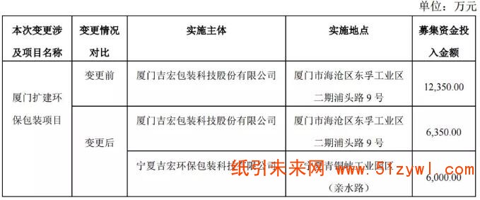現根據公司的長遠發展規劃及客戶的實際供貨需求,擬變更“廈門擴建環保包裝項目”部分募集資金6,000萬元投入至公司位于寧夏青銅峽工業園區(親水路)全資子公司寧夏吉宏環保包裝科技有限公司使用,即擬部分變更募投項目的實施主體為公司全資子公司寧夏吉宏環保包裝科技有限公司,實施地點為寧夏青銅峽工業園區(親水路)。具體情況如下: