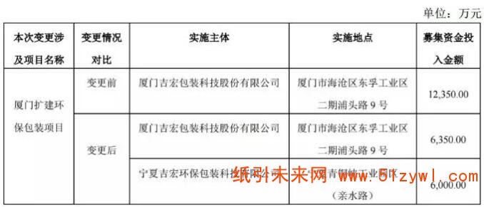 現根據公司的長遠發展規劃及客戶的實際供貨需求,擬變更“廈門擴建環保包裝項目”部分募集資金6,000萬元投入至公司位于寧夏青銅峽工業園區(親水路)全資子公司寧夏吉宏環保包裝科技有限公司使用,即擬部分變更募投項目的實施主體為公司全資子公司寧夏吉宏環保包裝科技有限公司,實施地點為寧夏青銅峽工業園區(親水路)。具體情況如下: