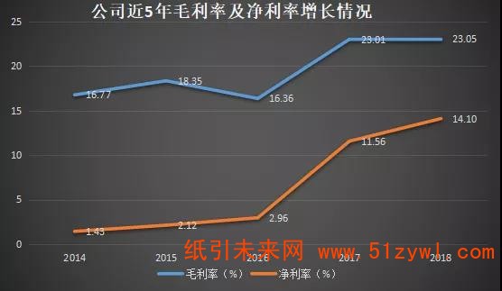 2018年山鷹紙業實現毛利率和凈利率分別為23.05%和14.10%,同比增長0.04和2.54個百分點。凈利率從2014年的1.43%上升到2018年的14.10%,連續5年持續上升,遠超同級別晨鳴紙業的8.88%和太陽紙業的10.30%。與此同時,加權凈資產收益率為27.55%,比上一年增長6.01個百分點,盈利能力逐年提高。