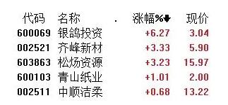 根據(jù)“第一財(cái)經(jīng)”,11月12日上午,造紙板塊漲勢強(qiáng)勁,銀鴿投資漲超6%,齊峰新材、青山紙業(yè)、中順潔柔等其余多股均有不同程度的拉升。