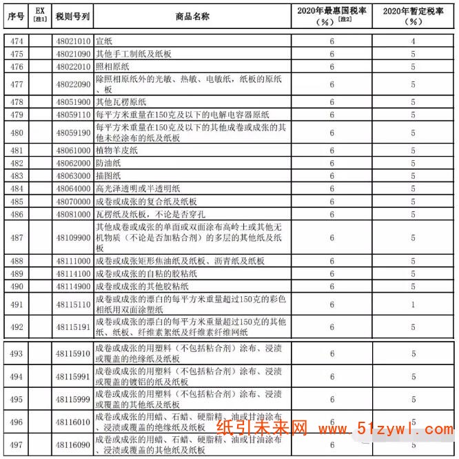 稅則號為48051900的其他瓦楞原紙,2020年最惠國稅率為6%,2020年暫定稅率為5%;