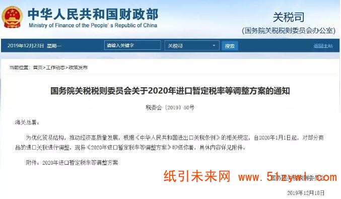 紙引未來網訊 為優化貿易結構,推動經濟高質量發展,日前,國務院關稅稅則委員會印發通知稱,自2020年1月1日起,將對850余項商品實施低于最惠國稅率的進口暫定稅率。筆者整理統計后發現,該批商品涉及瓦楞紙、紙板以及部分印刷品