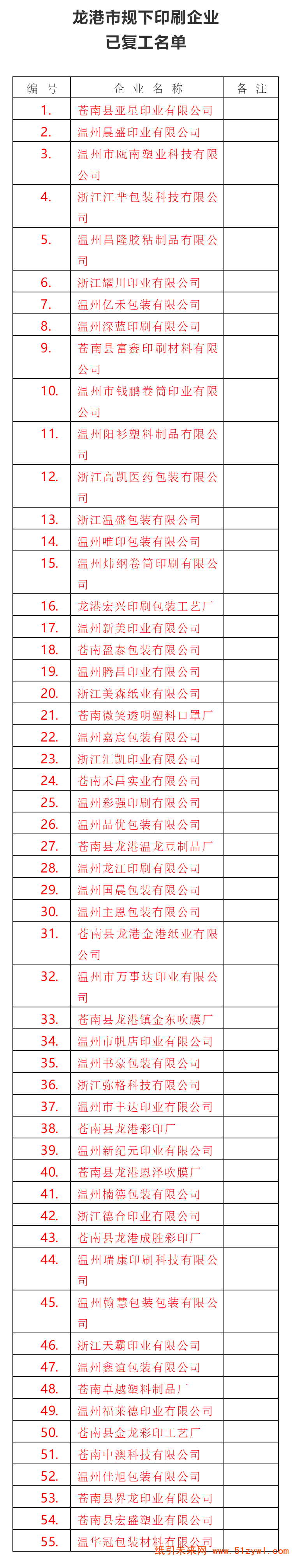核心提示:截至2月18日,龍港市111家規上工業企業和規下工業企業56家已復工復產。全市商貿企業139家(含個體),已申請開工64家,已復工39家商貿企業。印刷企業名單如下: