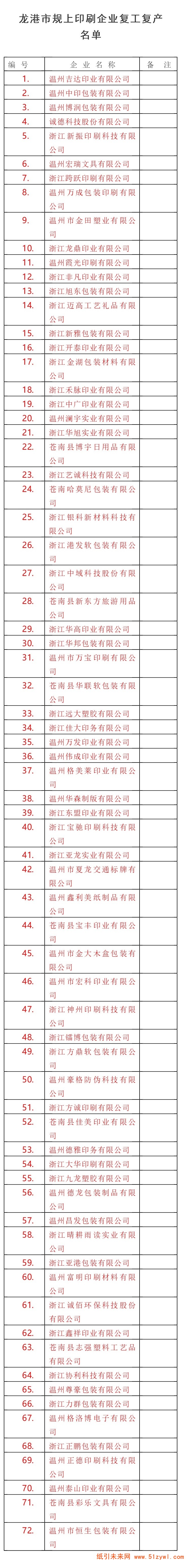 紙引未來網訊 截至2月18日,龍港市111家規上工業企業和規下工業企業56家已復工復產。全市商貿企業139家(含個體),已申請開工64家,已復工39家商貿企業。印刷企業名單如下: