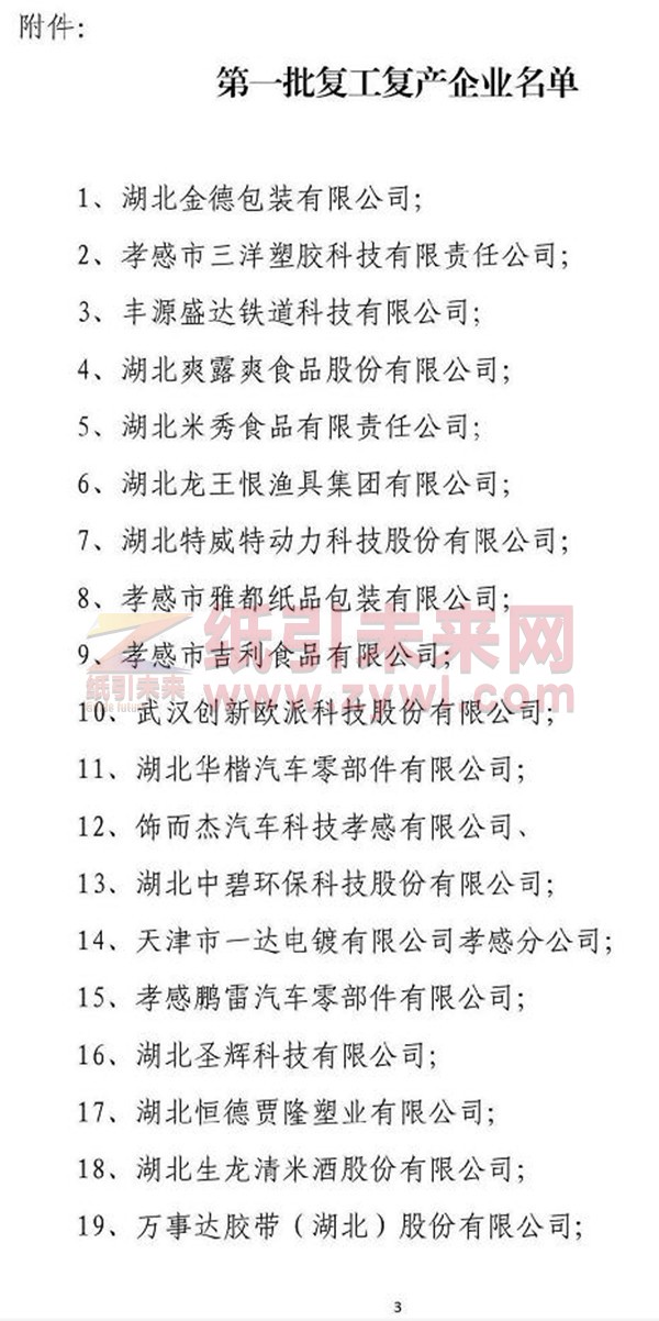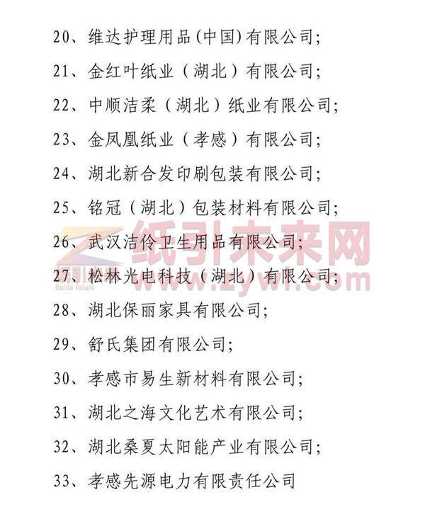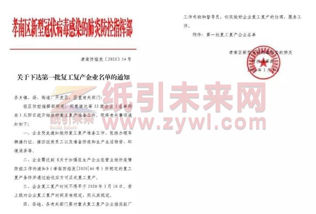 紙引未來網訊 據孝感廣電微信公眾號3月8日消息,孝南區當日發布通知,公布了第一批33家復工復產企業名單,包括了維達、金紅葉、中順潔柔以及金鳳凰紙業四家造紙企業。