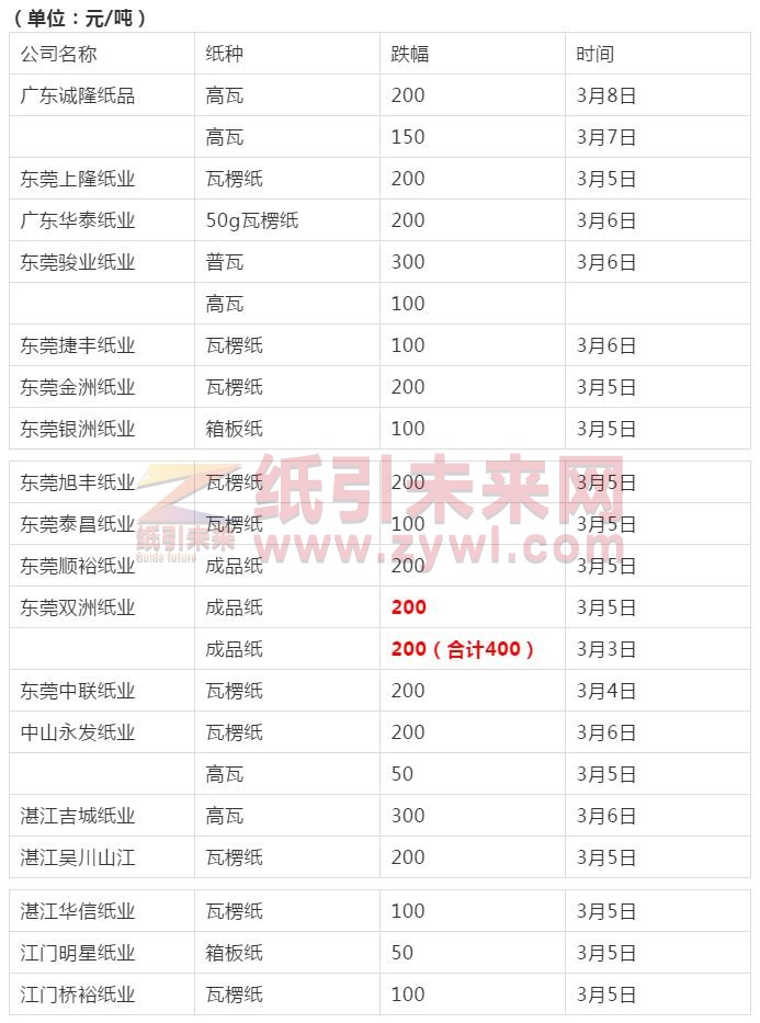 紙引未來網訊 3月3日開始,紙業市場開始出現降價,近兩日愈演愈烈。這輪降價由廣東東莞發起,紙廠單次降幅普遍在200-300元/噸。更有甚者,接連2-3天內連降兩次,合計跌幅高達400元/噸。此外,也有紙廠以預付優惠的方式,刺激下游下單!