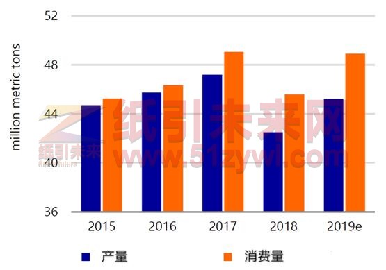 同時,在中國RCP政策導(dǎo)致2018年箱板紙需求同比大幅下降7.9%之后,中國的箱板紙需求似乎在2019年有所回升。根據(jù)我們的估計,2019年箱板紙的消費量約為4890萬噸,同比增長7.3%,基本恢復(fù)到2017年的水平(見圖2)。但是,如上所述,可用的RCP供應(yīng)僅足以生產(chǎn)4510萬噸的箱板紙。這就為國內(nèi)生產(chǎn)約380萬噸箱板紙所需的RCP(價值約410萬噸)留出了一個缺口。盡管中國有足夠的箱板紙產(chǎn)能來生產(chǎn)這一數(shù)量。