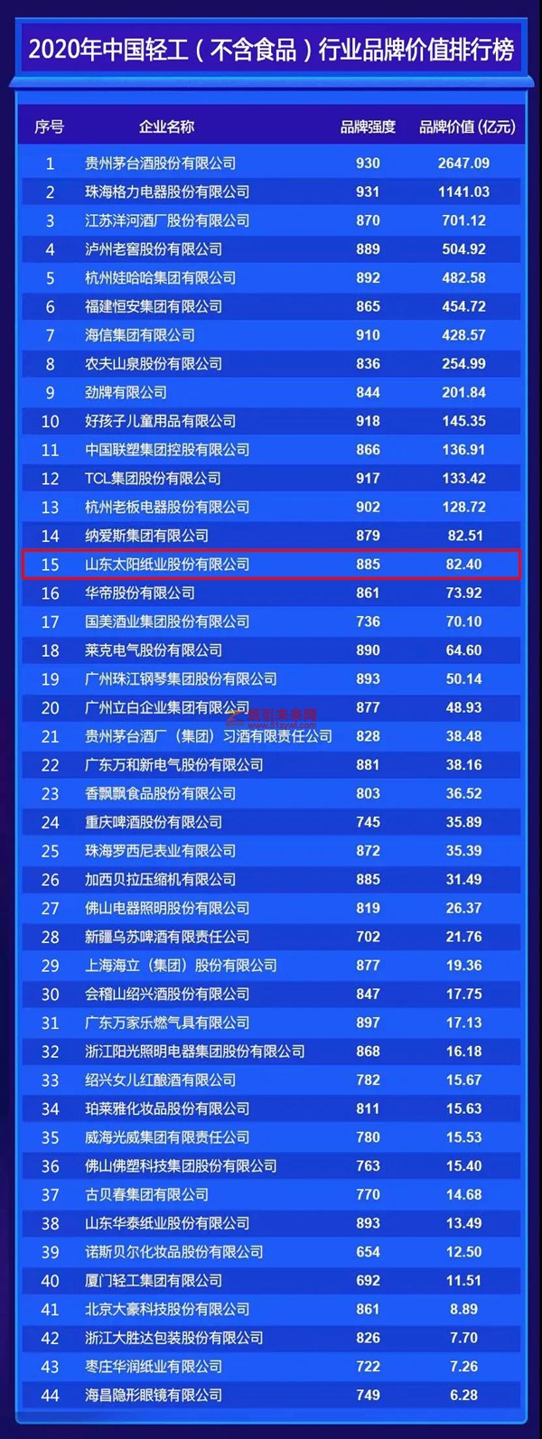 2020中國品牌價值評價發布 太陽紙業位列輕工行業第十五位