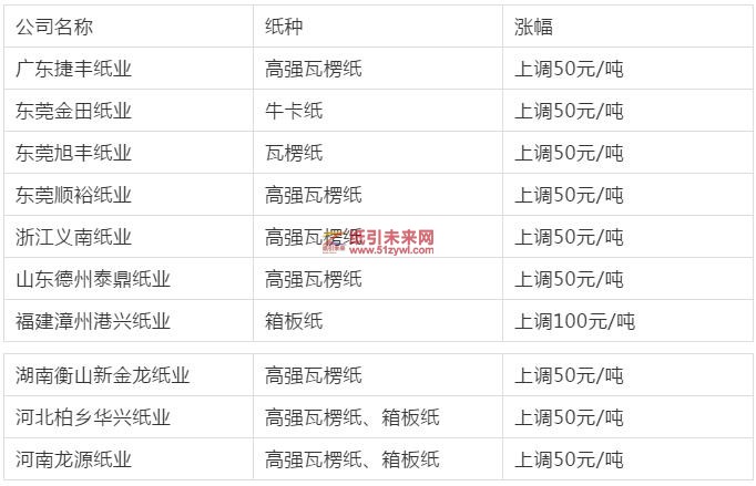 玉田縣順發(fā)實業(yè):因受近日原材料價格持續(xù)增漲,貨源緊張的因素且環(huán)保成本增加,公司決定自5月22日起所有克重及品項的成品紙每噸上調(diào)50元。