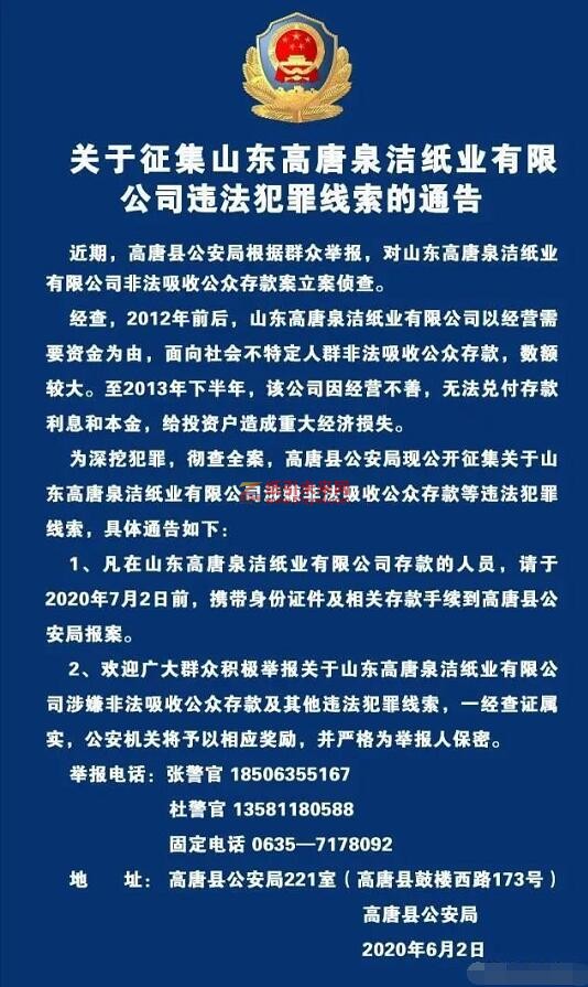 為深挖犯罪,徹查全案,高唐縣公安局公開征集關于山東高唐泉潔紙業有限公司涉嫌非法吸收公眾存款等違法犯罪線索。凡在山東高唐泉潔紙業有限公司存款的人員,請于2020年7月2日前,攜帶身份證件及相關存款手續到高唐縣公安局報案。