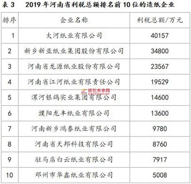 2019年河南省重點造紙企業中完成產量、主營業務收入、利稅總額、利潤總額排名前10位的造紙企業分別見表1~表4。