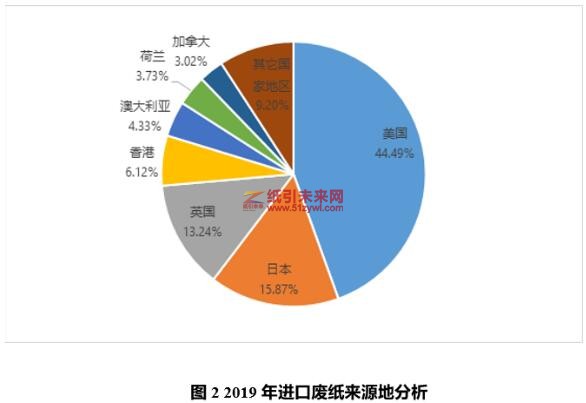 從廢紙進口來源地看,美國在2019年仍然是我國進口廢紙的最大來源地,進口量為461.04萬噸,占比44.49%,較上年提高7.31個百分點;其次為日本的164.5萬噸,占比15.87%,同比下降0.31個百分點;第三為英國,占比13.24%,同比上升0.91個百分點;然后是香港和澳大利亞。