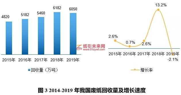 廢紙作為節能減排效果顯著的再生資源品種之一,每年為造紙企業提供了近70%的生產原料。中國再生資源回收利用協會廢紙分會統計數據顯示,近6年來我國廢紙回收量整體上行,其中2018年的回收量達到6,182萬噸,同比增長13.2%,行業總產值約為1,600億元。2019年由于中美貿易爭端及終端需求的影響,廢紙回收量略有下降,占全球廢紙回收量的24.5%,國內回收率已達到65%以上,在國際廢紙回收利用方面處于較高水平。隨著國內消費增長的逐漸平穩和未來造紙行業的產業結構調整,國內廢紙回收量年均增長率將保持在4%左右,預計2025年國內廢紙回收量將超過7,500萬噸。