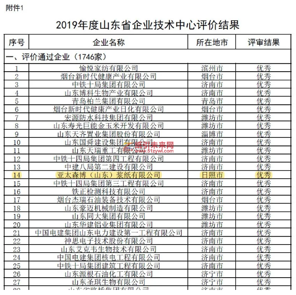 紙引未來網訊 近日,山東省發展和改革委員會發布省級企業技術中心2019年評價結果,在全省1952家省級企業技術中心中,共有75家企業技術中心得分在90分及以上,被評為優秀。亞太森博(山東)漿紙有限公司技術中心在此次評估中,排名第14,是此次日照市唯一一家獲評優秀的企業技術中心,也是全省制漿造紙企業中唯一一家獲評優秀的企業技術中心。
