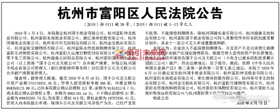 根據杭州市富陽人民法院發布的最新公告,杭州國豐紙業及其關聯公司凈資產為負,已嚴重資不抵債,不能清償到期債務。其中有3家公司已被批準重整計劃,破產企業共有11家,分別為杭州國豐紙業、杭州富陽神龍紙業、杭州富陽東南紙業、浙江順舟控股、杭州美可巾無紡制品、杭州金寶機床、杭州富陽寶臻物資、杭州富陽永偉廢紙購銷、杭州富陽東鴻物資、杭州富陽久運廢舊物資回收、杭州富陽榮豐化工。具體公告如下: