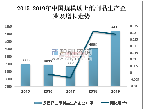2015-2019年中國規模以上紙制品生產企業及增長走勢