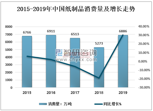 2018年全國紙制品消費量5273萬噸,較上年增長-19.04%2019年全國紙制品消費量6886萬噸,較上年增長30.59%;