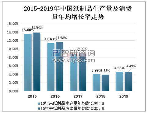2015-2019年中國紙制品生產量及消費量年均增長率走勢