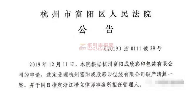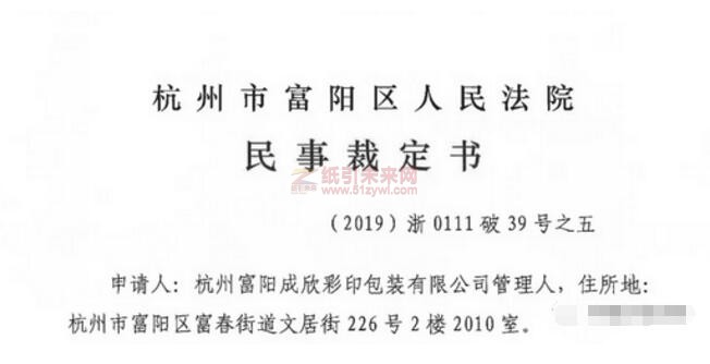 紙引未來網訊 近日,杭州市富陽區人民法院作出《民事裁定書》,裁定宣告杭州富陽成欣彩印包裝有限公司破產。該企業成立于2008年,經營范圍包括紙制品加工,紙箱、紙盒及包裝材料銷售等。