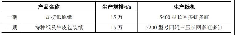 項(xiàng)目分二期建設(shè)。其中一期建設(shè)年產(chǎn)15萬(wàn)噸瓦楞原紙生產(chǎn)線(xiàn)1條;二期建設(shè)年產(chǎn)15萬(wàn)噸特種紙及牛皮包裝紙生產(chǎn)線(xiàn)1條。