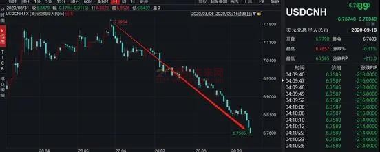 離岸人民幣兌美元升破6.76關口,日內漲超200點,刷新2019年5月以來新高,6月以來人民幣暴漲不斷,從7.2關口一路狂升至目前的6.76關口。在岸人民幣則從5月底的7.18關口升至目前的6.76關口。
