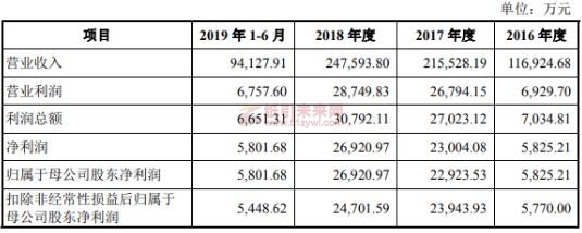 2016年-2019年上半年,森林包裝實現營業收入分別為11.70億元、21.55億元、24.76億元、9.41億元;歸屬于母公司股東凈利潤分別為5,825.21萬元、22,923.53萬元、26,920.97 萬元和5,801.68 萬元。