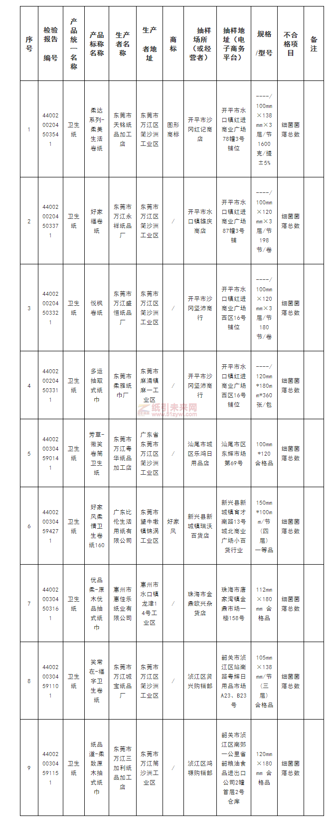 衛(wèi)生用紙制品產(chǎn)品不合格名單