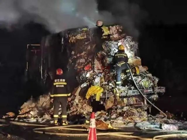隨后趕到現場的民警立即對現場進行了截流,并把所有人員撤離到安全地帶等待消防進行救援。21時18分,接到救援后的消防人員到達現場進行施救,隨著消防水槍的一陣陣猛射,現場的火勢時滅時起,由于廢紙是經過壓縮的,這也增加了滅火的難度,眼看著明火被滅了,壓縮紙內部的高溫經過一段時間的發熱又竄出猛烈的火苗。此時,跟隨消防一起開來的一輛挖機和一輛推土車把車上已經燃燒的廢紙從車上扒下來給消防車進行滅火,經過半個小時合力滅火,終于把這輛車的火給滅了,隨后高速交警組織養護對現場進行清理,到當晚的23時20分左右,高速公路恢復正常。