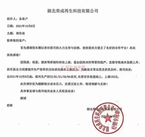 節(jié)后第一個工作日(10月8日),湖北榮成再生科技有限公司發(fā)布調(diào)價函稱,因國廢,紙漿,煤炭等原輔料持續(xù)上漲,疊加能耗雙控等管控趨嚴,直接導致成本急劇上升,公司雖全力挖潛提升生產(chǎn)效率仍無法消化成本上漲壓力,為確保正常運營及供貨及時,公司決定:自2021年10月8日起,公司生產(chǎn)的T2/B1/S1/SR/M4系列,在原有價格基礎(chǔ)上,上調(diào)150元。